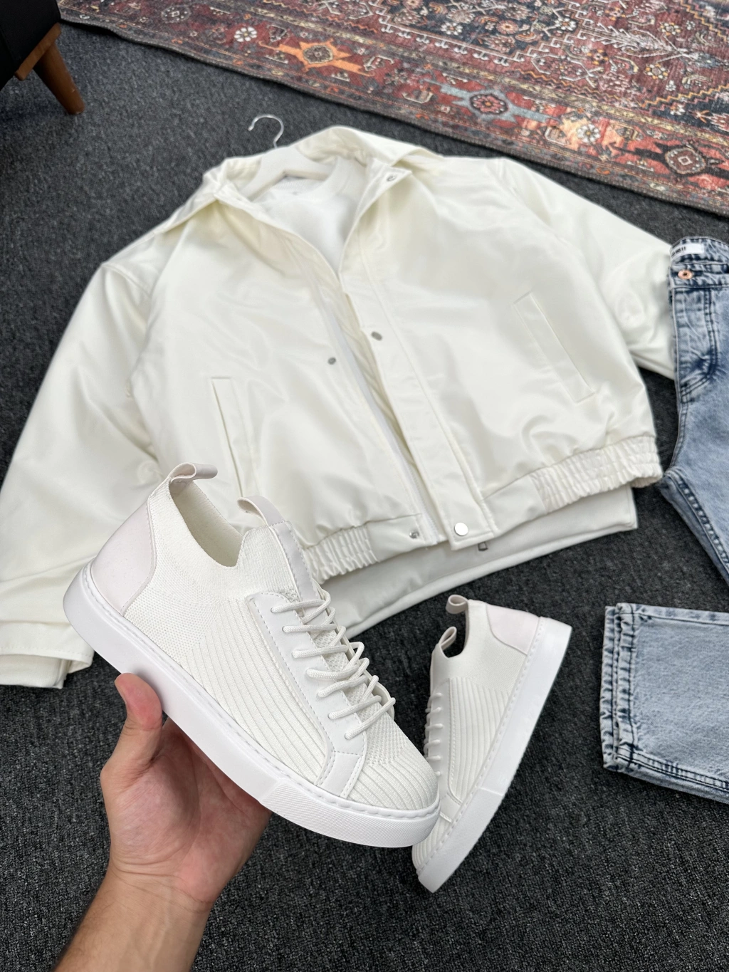 Beyaz Deri Oversize Bomber Ceket & Mavi Kar Yıkama Boyfriend Kot Pantolon Kombin