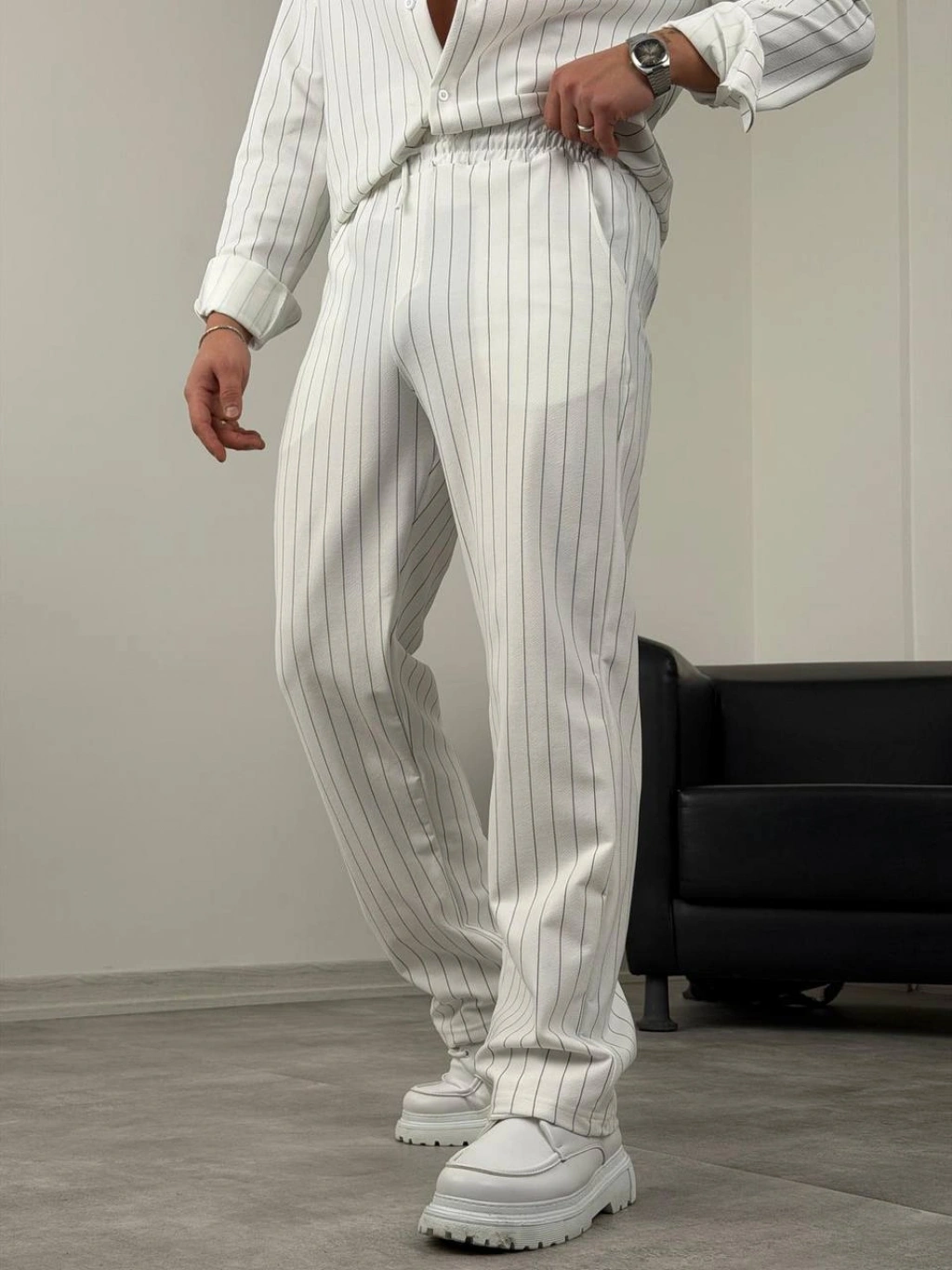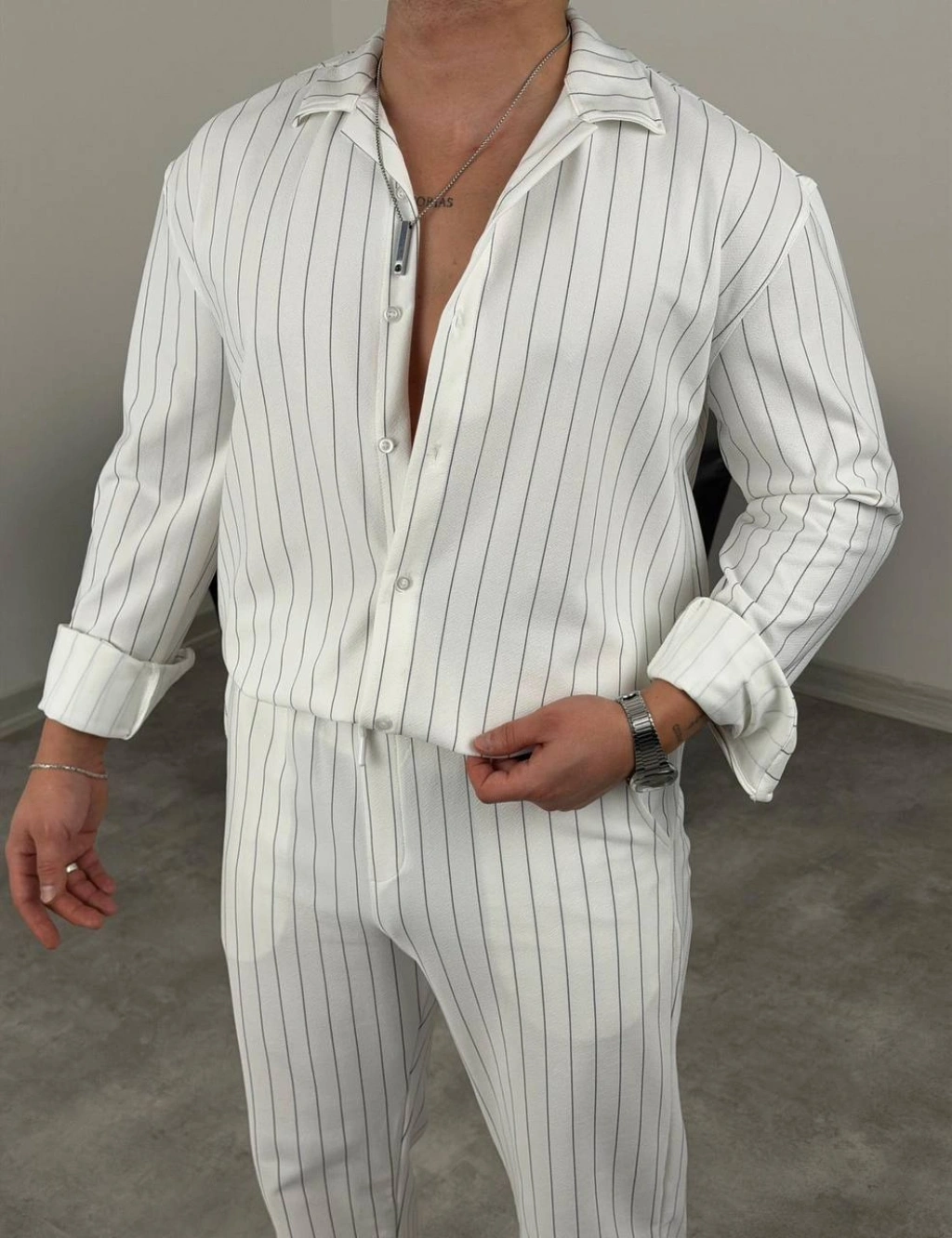 Beyaz Krep Kumaş Çizgili Gömlek Pantolon Takım