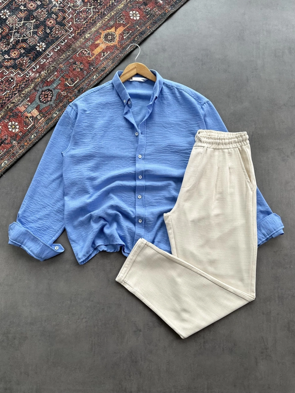 Erkek Lacivert Müslin Kumaş Gömlek & Beyaz Ham Keten Pantolon