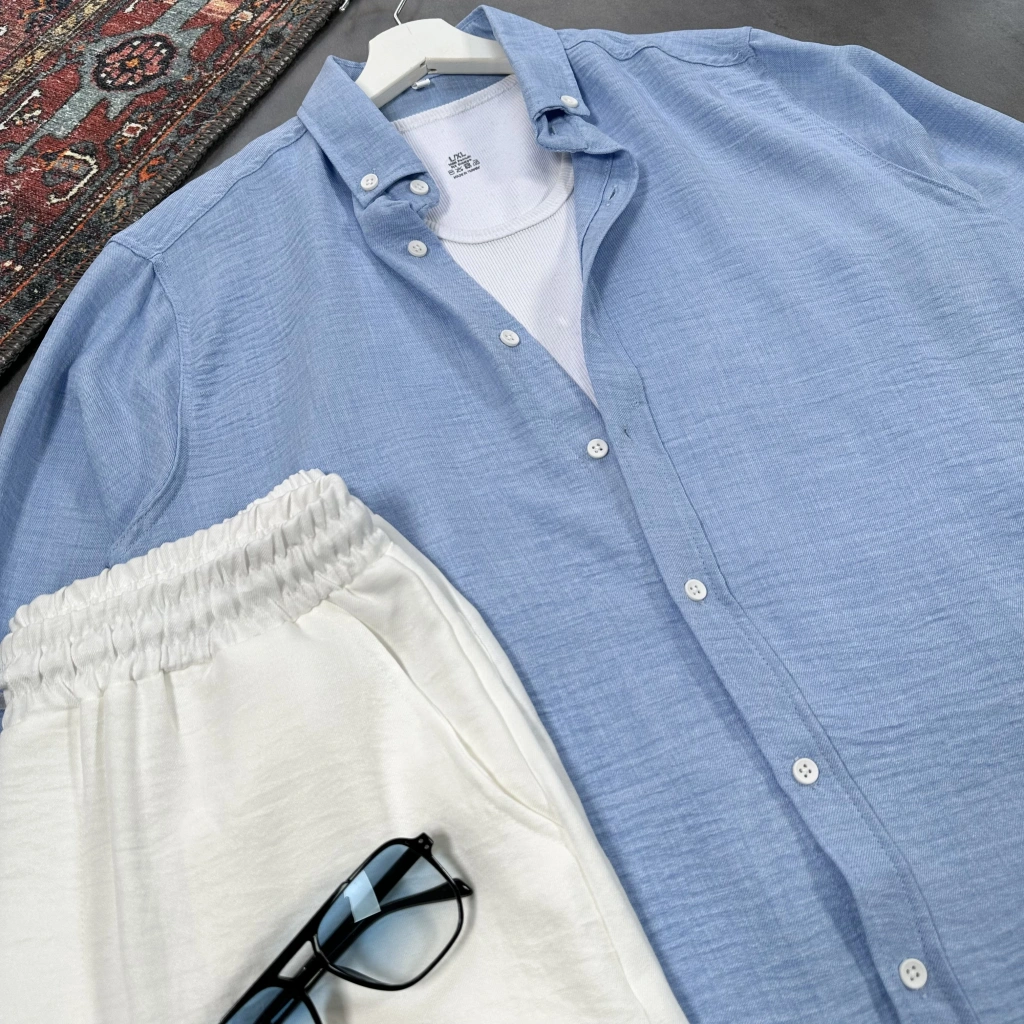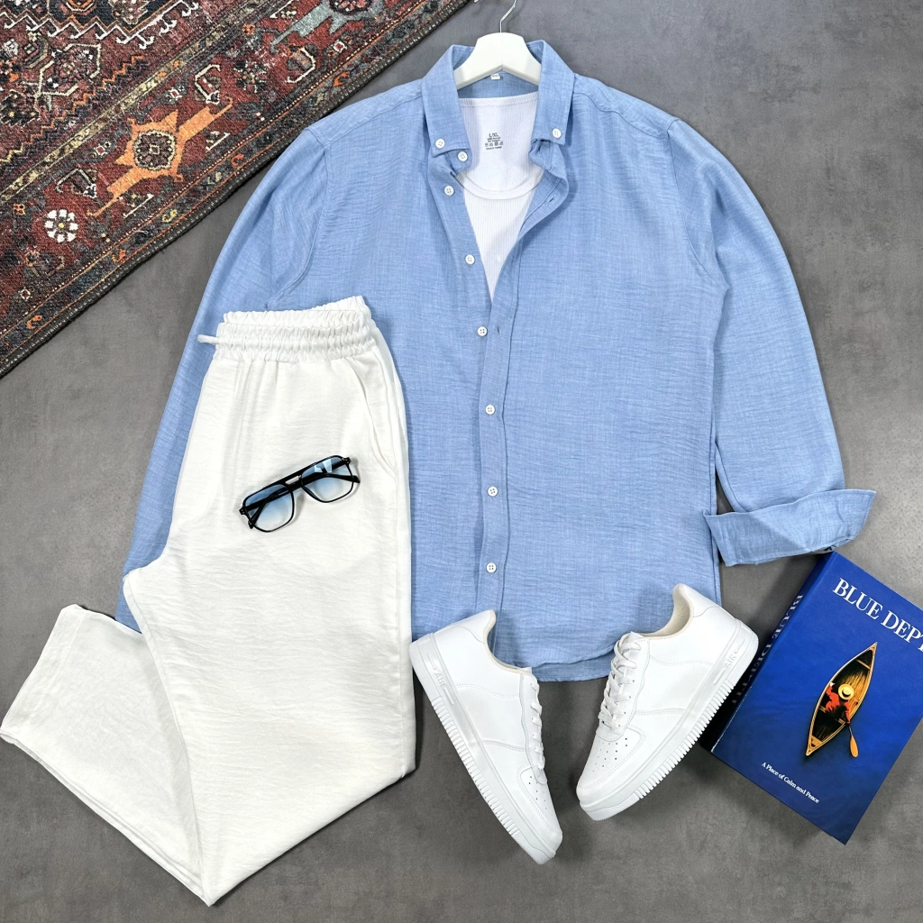 Erkek Mavi Müslin Kumaş Gömlek & Bej Ham Keten Pantolon