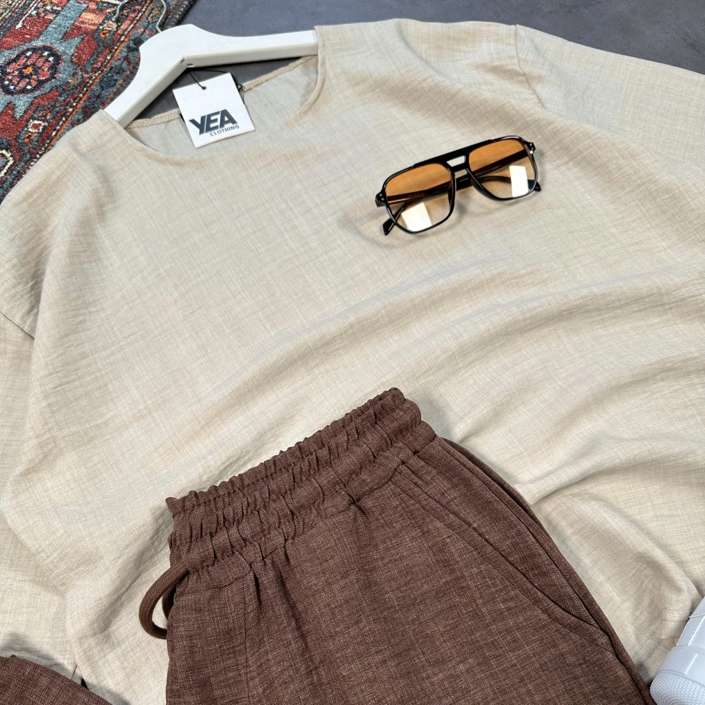 Erkek Bej Oversize Bisiklet Yaka T-shirt & Kahverengi Pantolon Takım