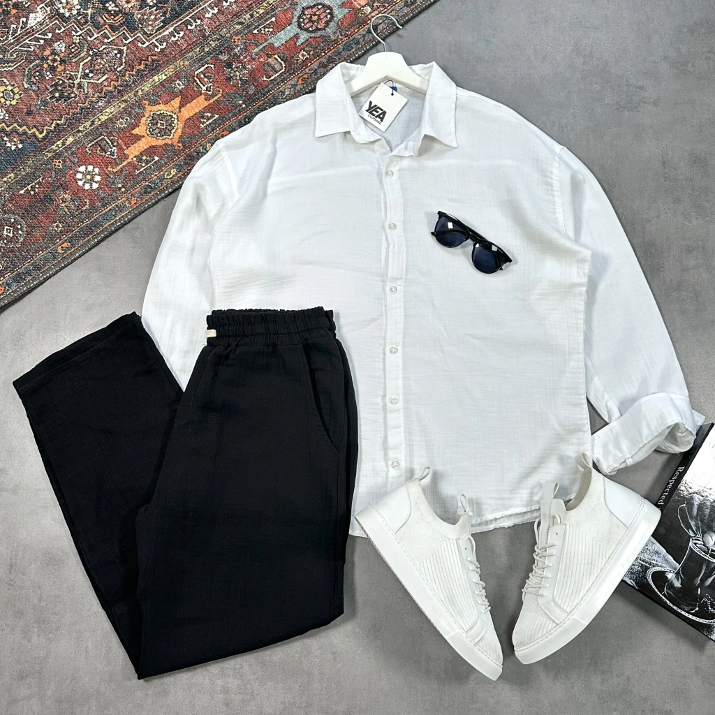 Erkek Beyaz Krinkıl Keten Gömlek & Siyah Pantolon Takım
