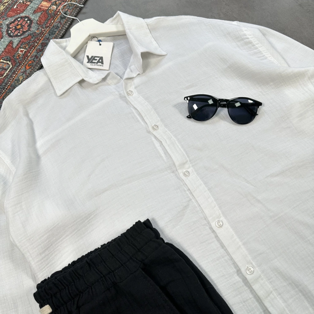 Erkek Siyah Krinkıl Keten Gömlek & Beyaz Pantolon Takım