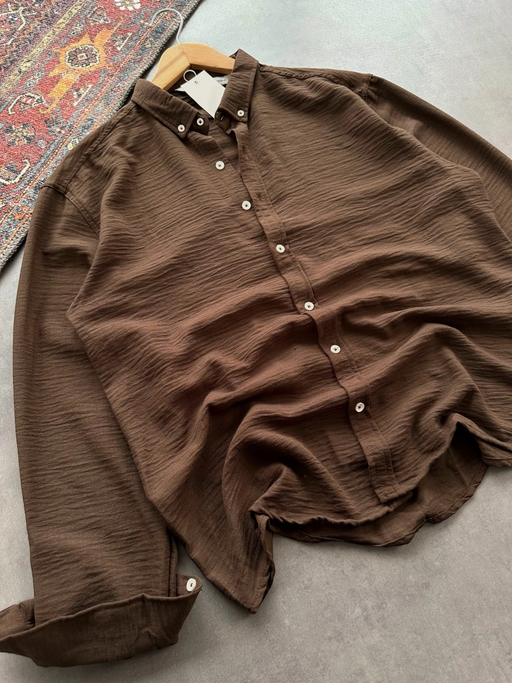 Kahverengi Erkek Oversize Müslin Kumaş Gömlek