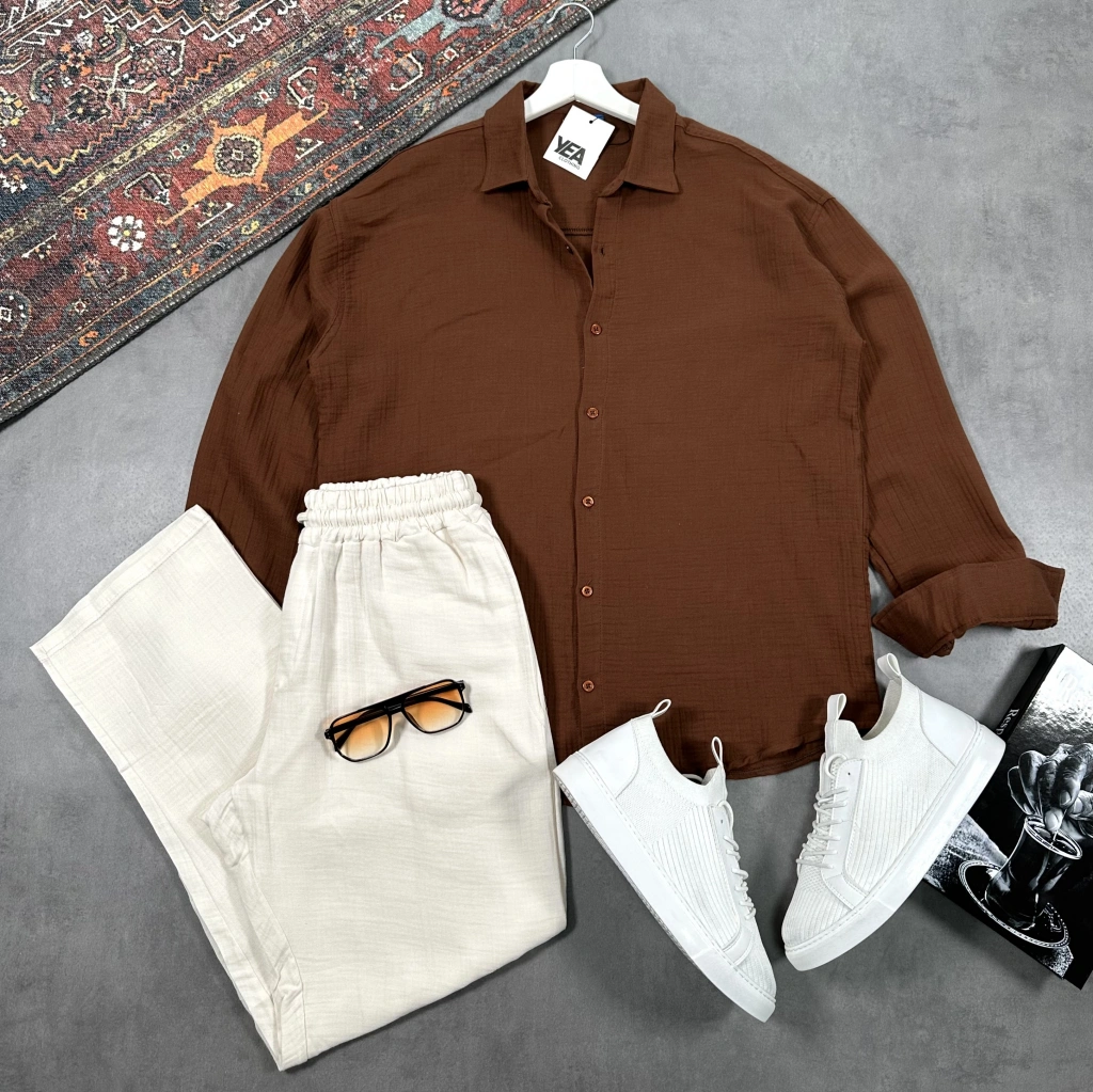 Erkek Kahverengi Müslin Gömlek & Beyaz Pantolon Takım