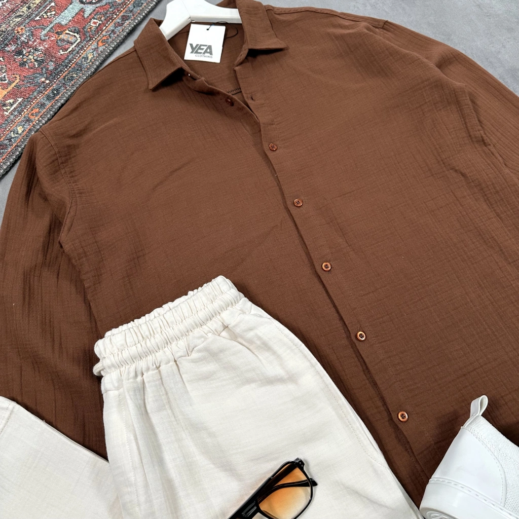 Erkek Bej Krinkıl Keten Gömlek & Kahverengi Pantolon Takım