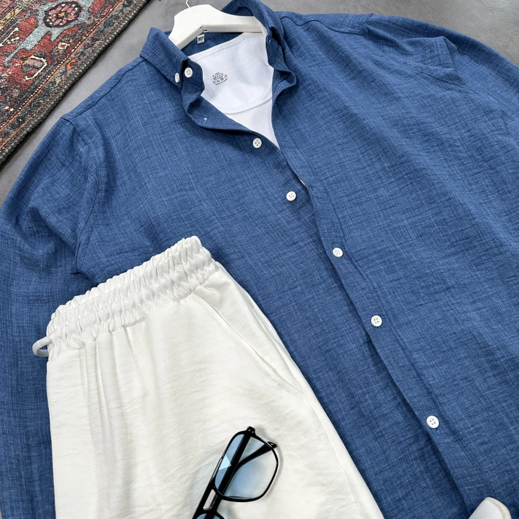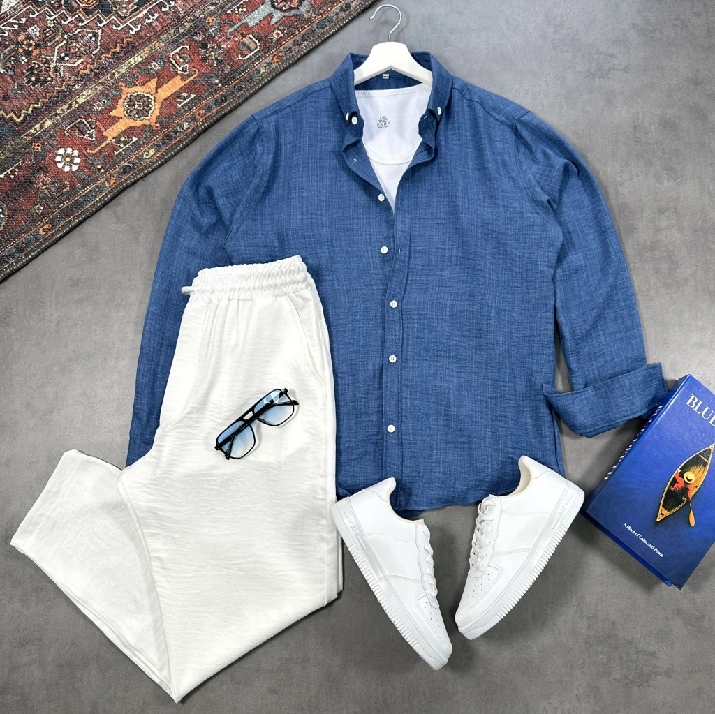 Erkek Lacivert Müslin Kumaş Gömlek & Beyaz Ham Keten Pantolon