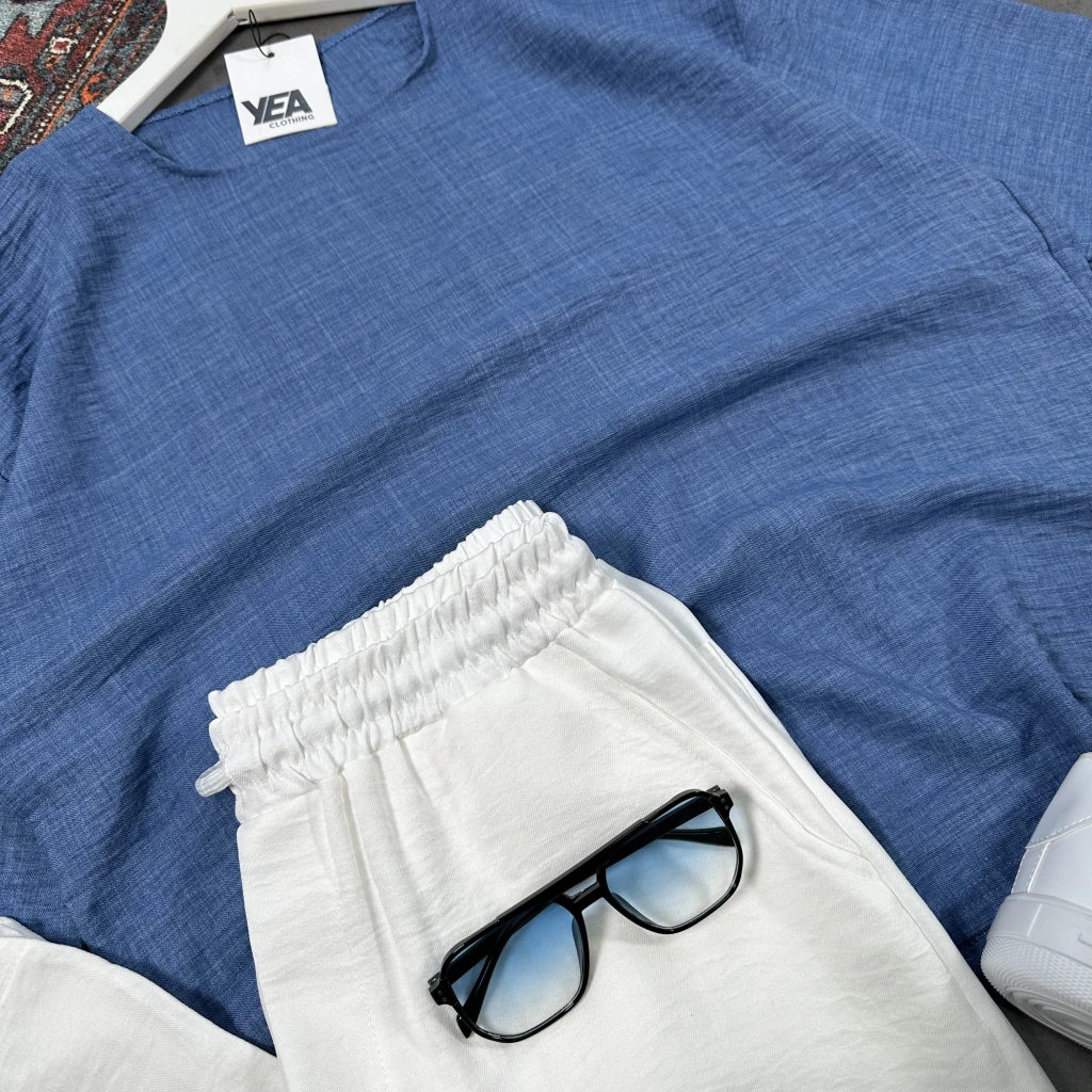 Erkek Lacivert Oversize Bisiklet Yaka T-shirt & Beyaz Pantolon Takım