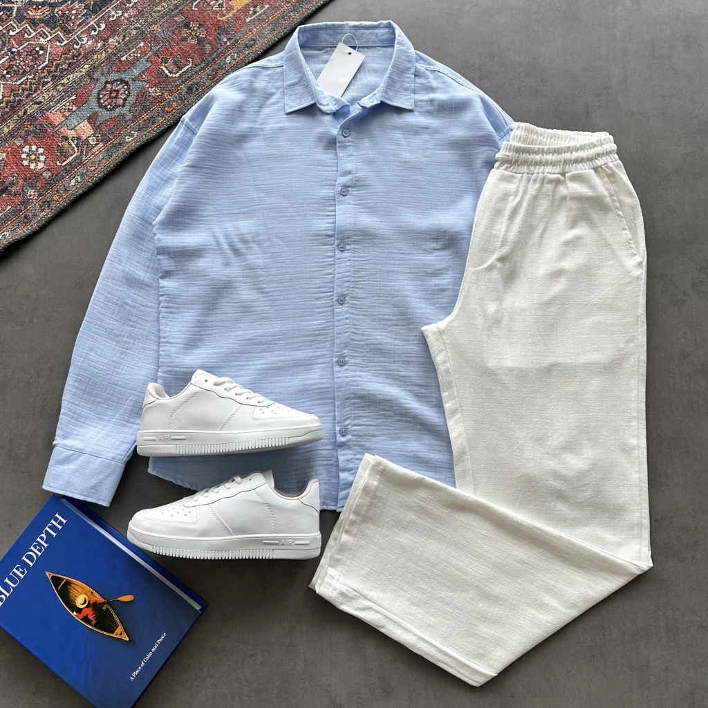 Erkek Mavi Müslin Kumaş Gömlek & Beyaz Ham Keten Pantolon