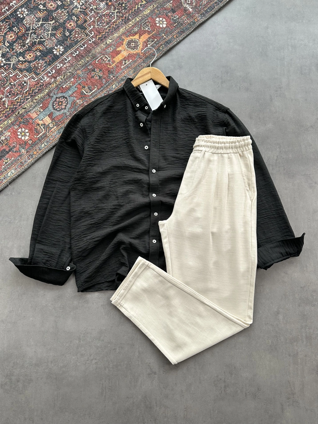 Erkek Siyah Müslin Kumaş Gömlek & Beyaz Ham Keten Pantolon