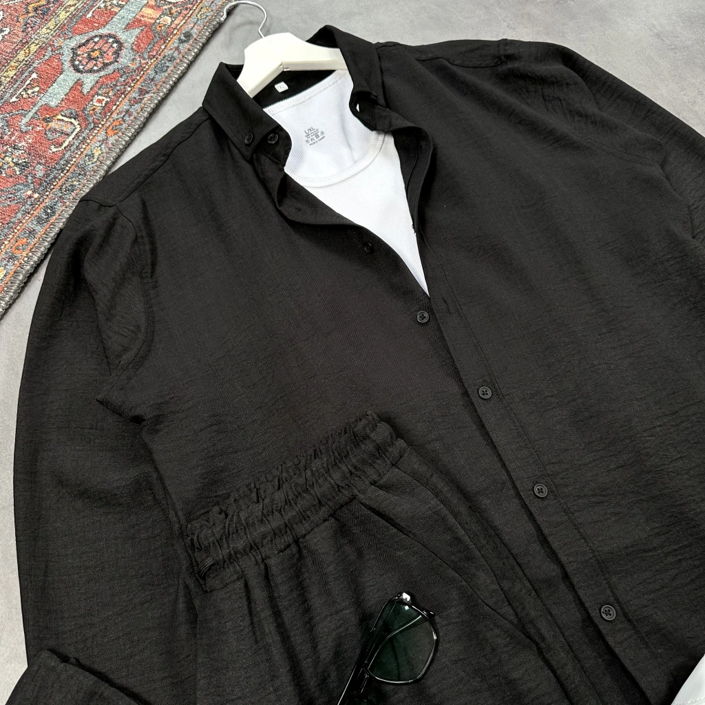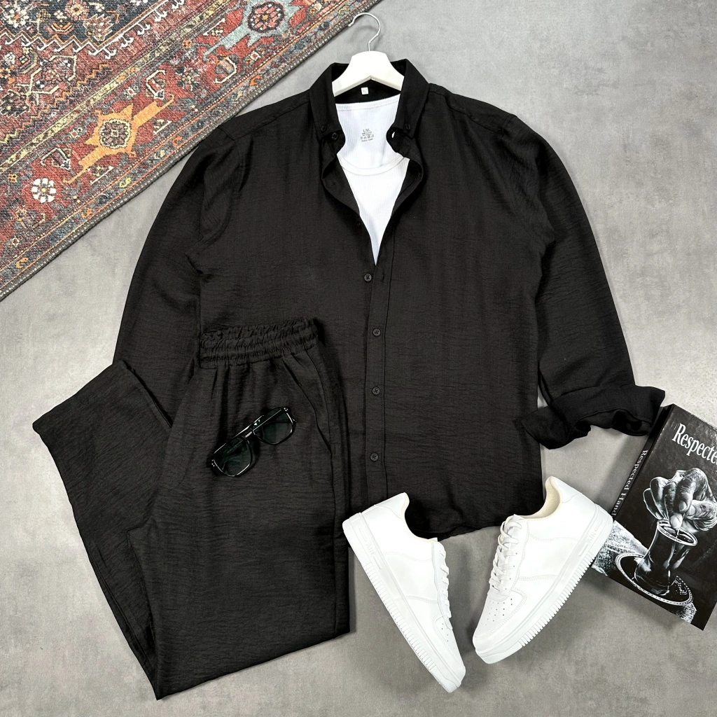 Erkek Siyah Krinkıl Keten Gömlek & Siyah Pantolon Takım