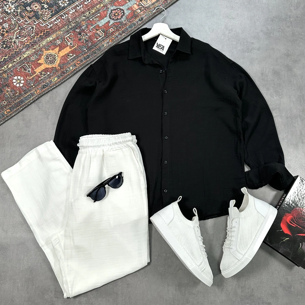 Erkek Siyah Krinkıl Keten Gömlek & Beyaz Pantolon Takım