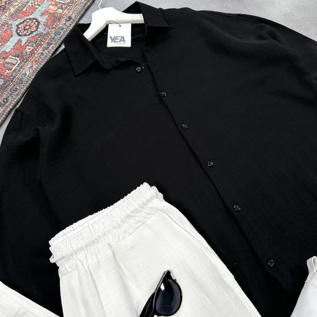 Erkek Siyah Krinkıl Keten Gömlek & Siyah Pantolon Takım