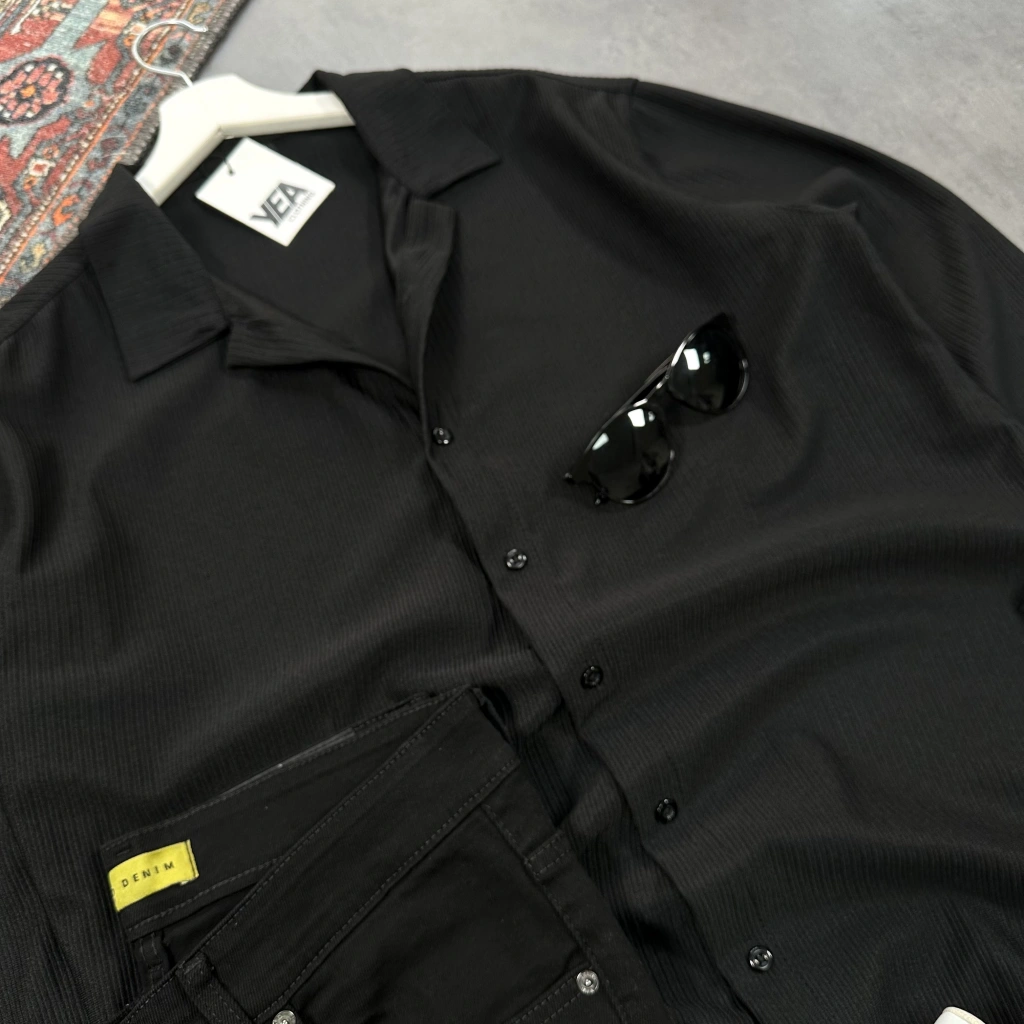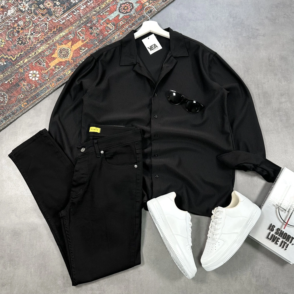 Erkek Siyah Ottoman Fitilli Gömlek & Siyah Slim Fit Kot Pantolon 2'li Set