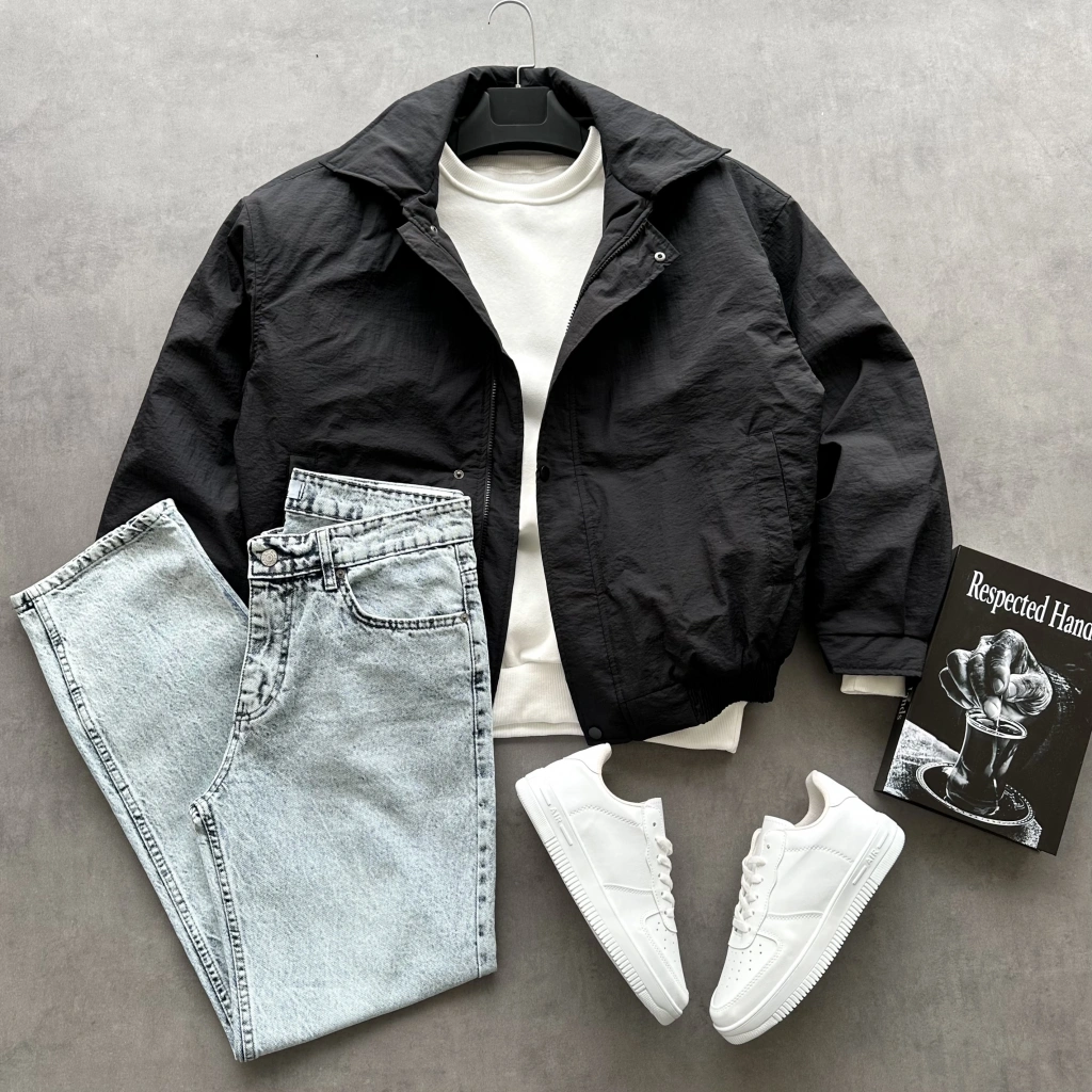 Erkek Siyah Oversize Krinkıl Bomber Ceket & Füme Kar Yıkama Baggy Kot Pantolon Kombini