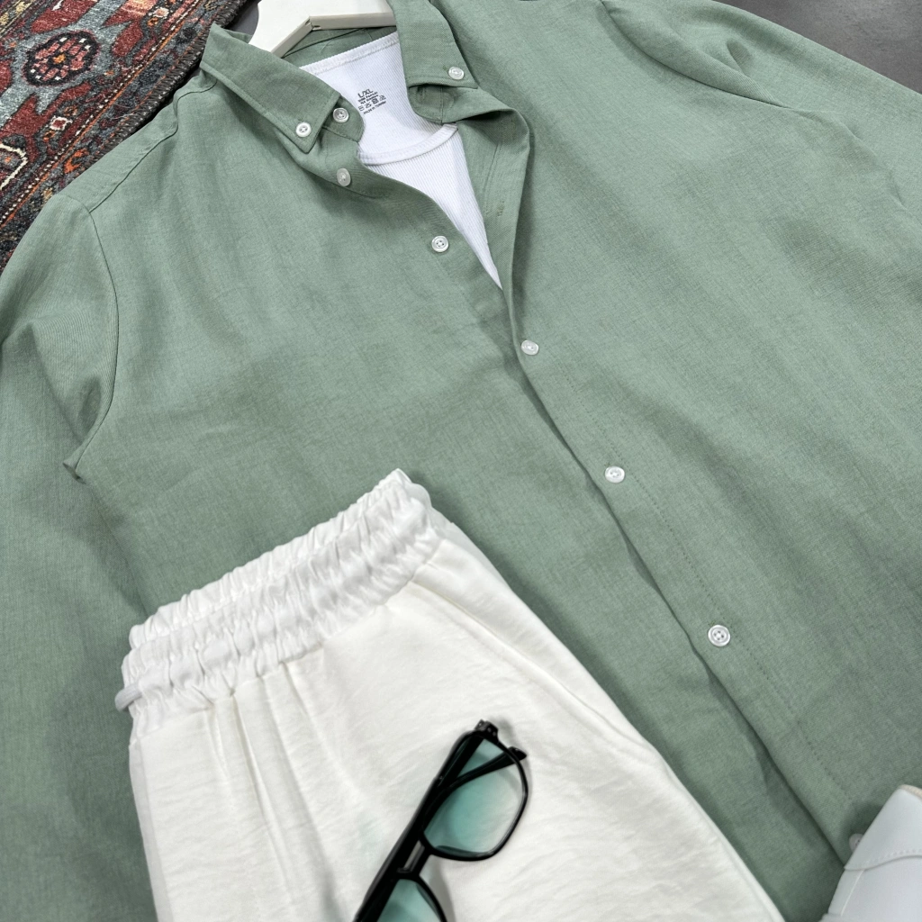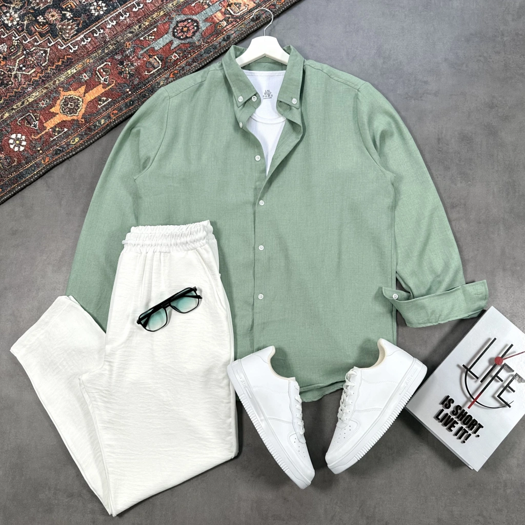 Erkek Zümrüt Müslin Kumaş Gömlek & Beyaz Ham Keten Pantolon