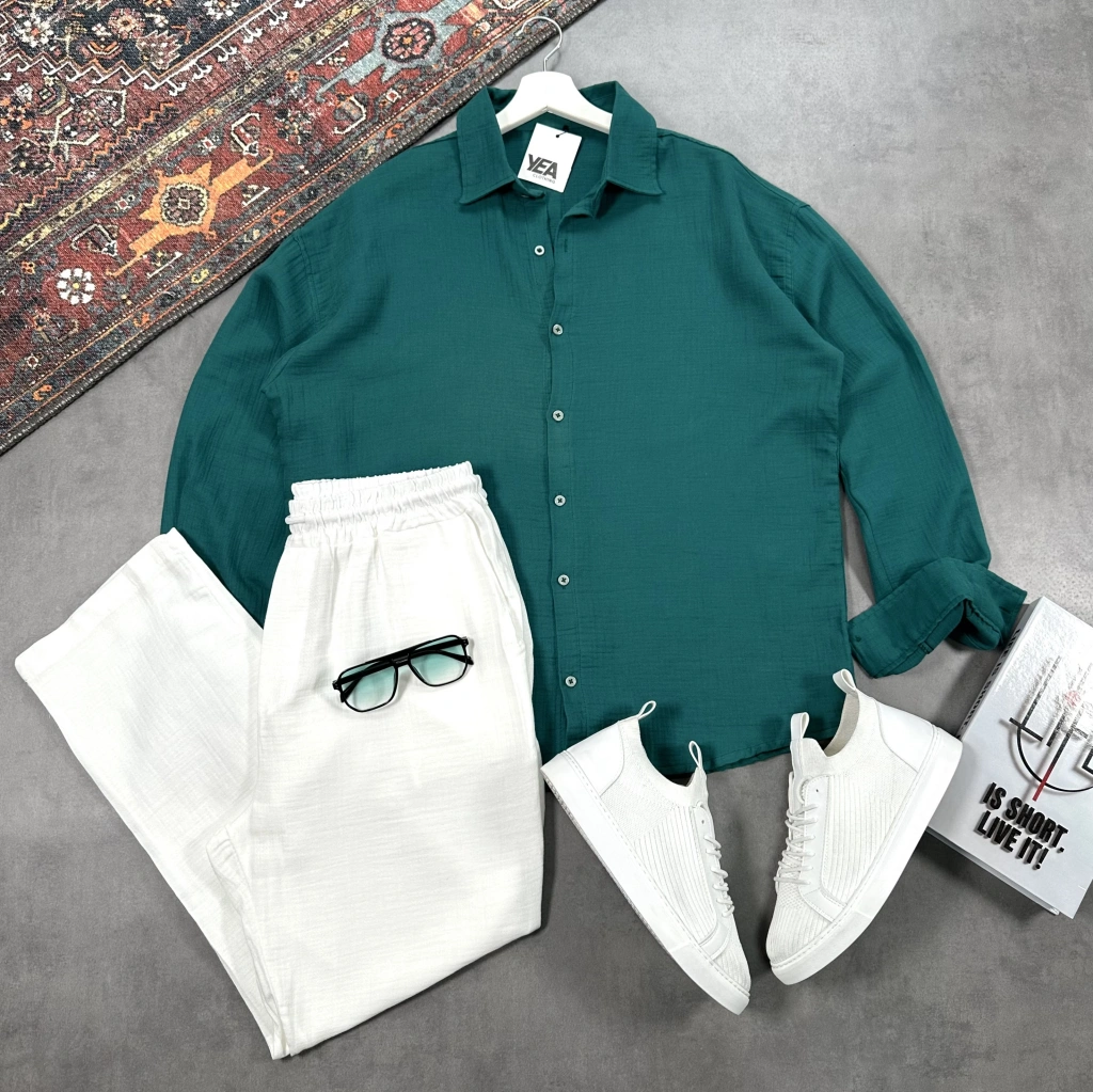 Erkek Yeşil Krinkıl Keten Gömlek & Beyaz Pantolon Takım