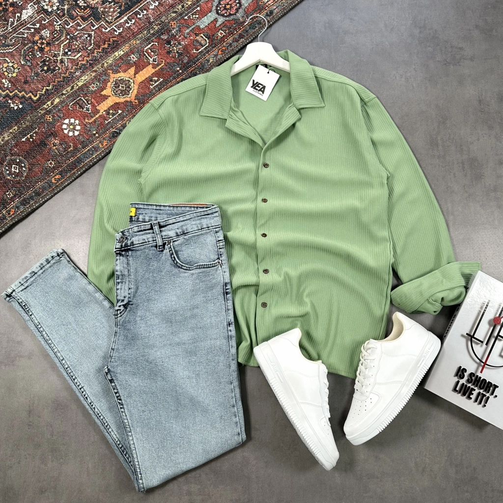 Erkek Yeşil Ottoman Fitilli Gömlek & Mavi Slim Fit Kot Pantolon 2'li Set