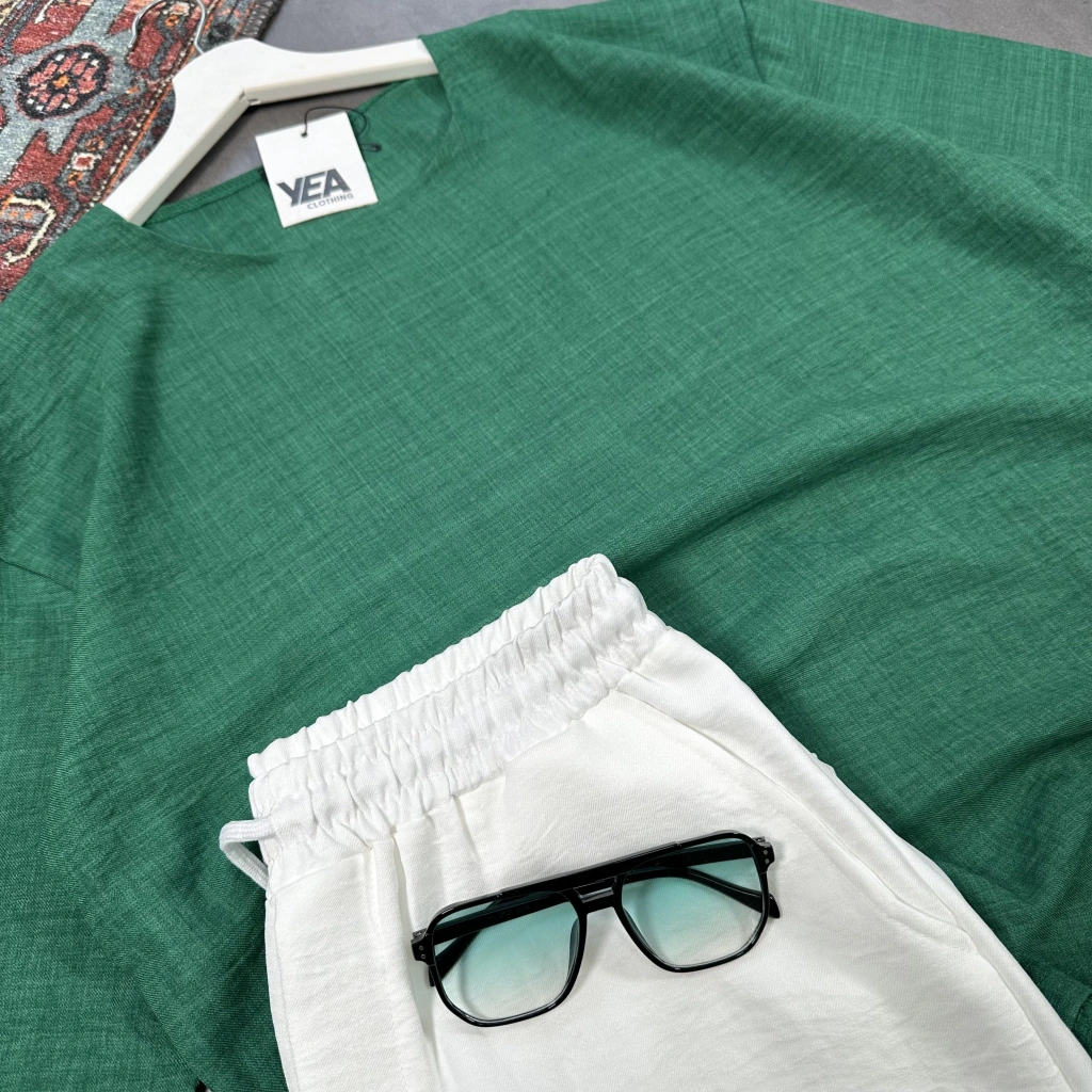 Erkek Yeşil Oversize Bisiklet Yaka T-shirt & Beyaz Pantolon Takım