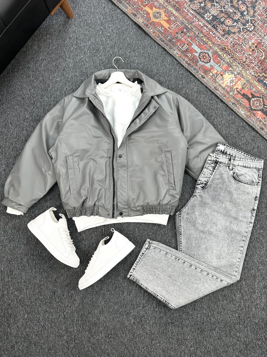Gri Deri Oversize Bomber Ceket & Füme Kar Yıkama Boyfriend Kot Pantolon Kombin