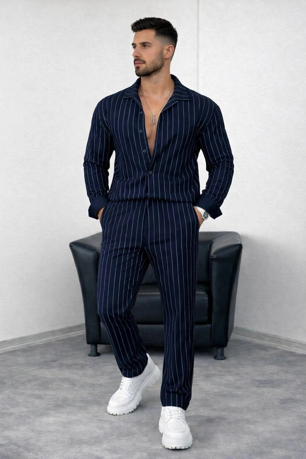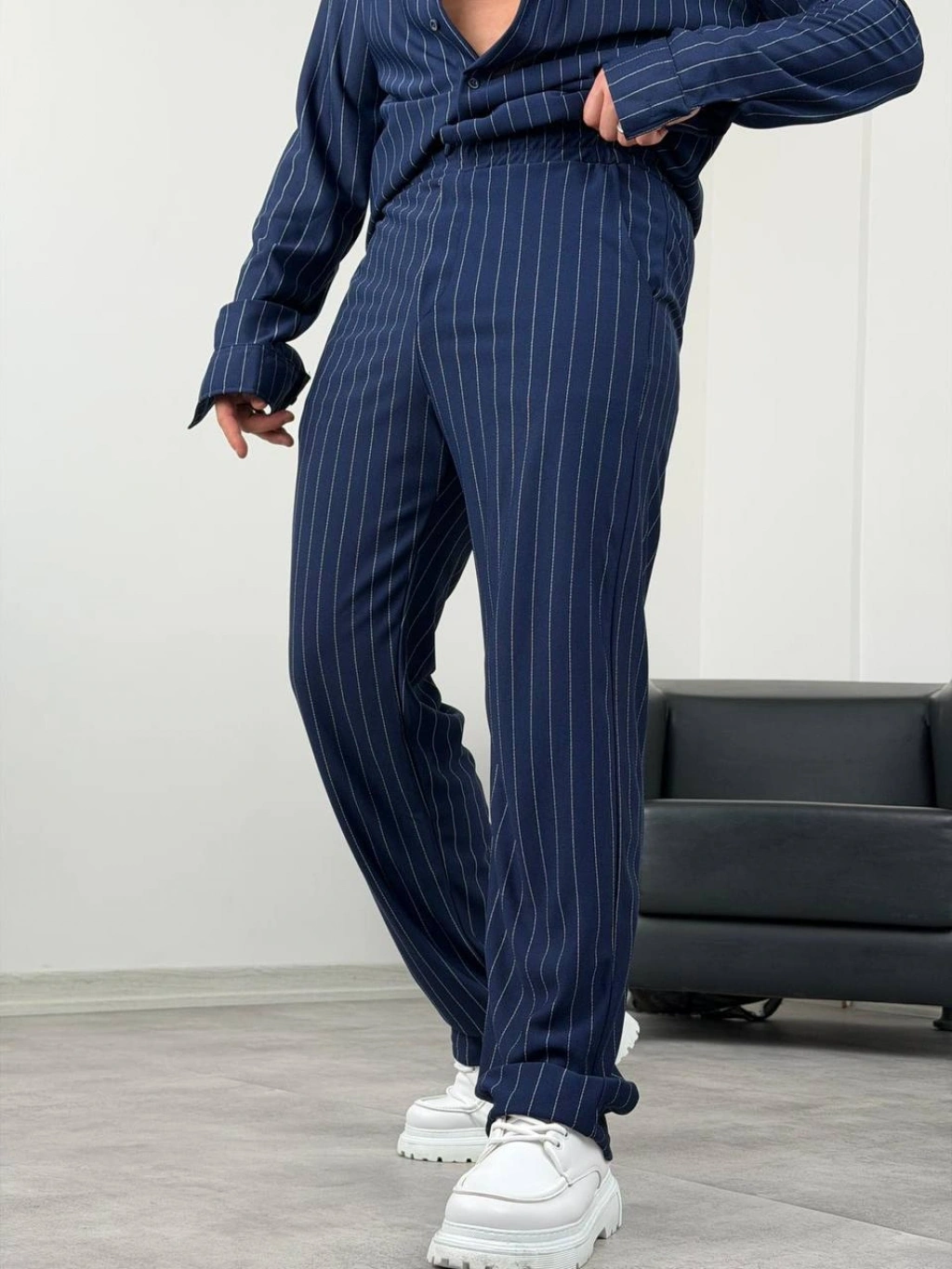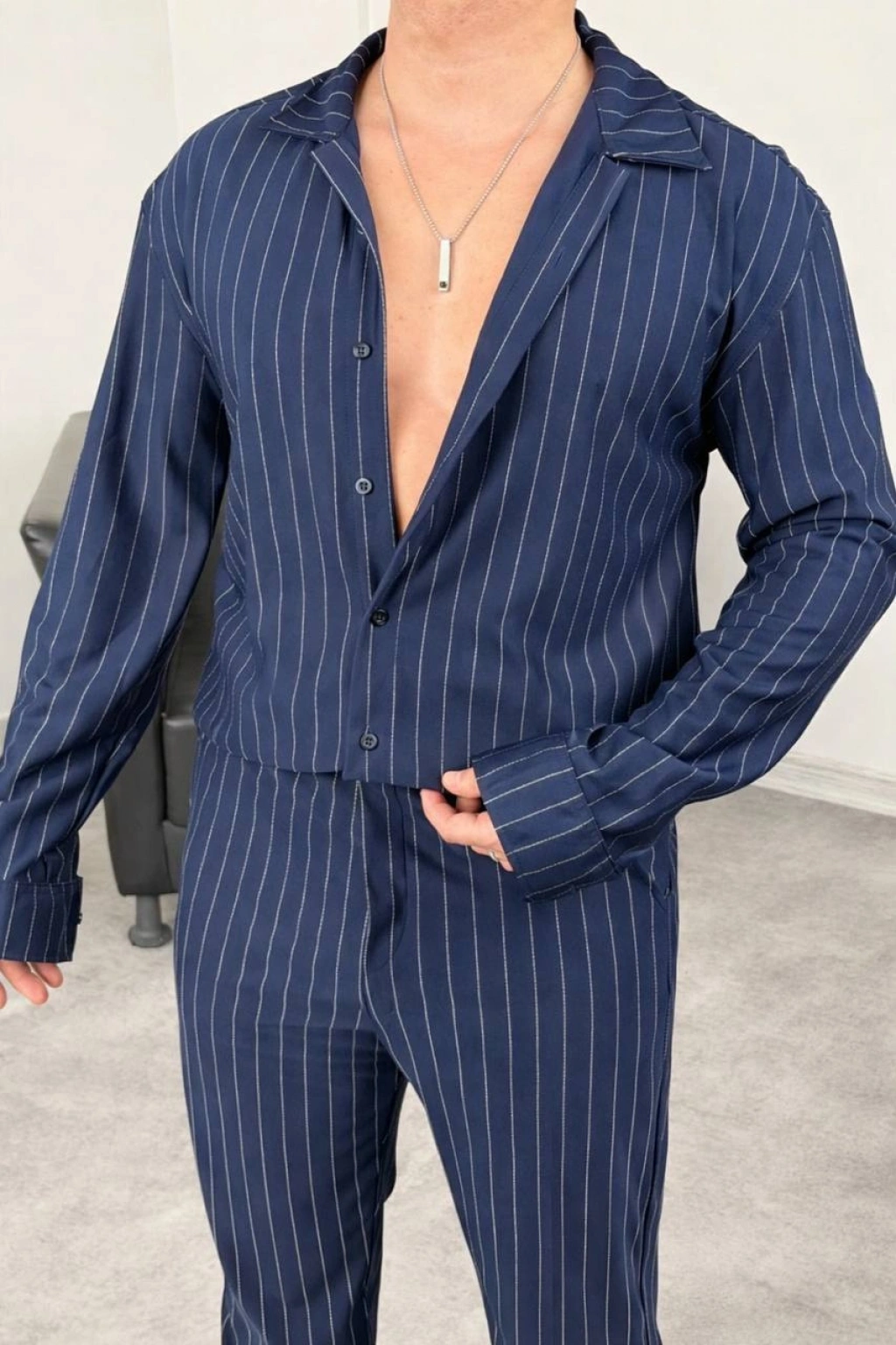 Lacivert Krep Kumaş Çizgili Gömlek Pantolon Takım