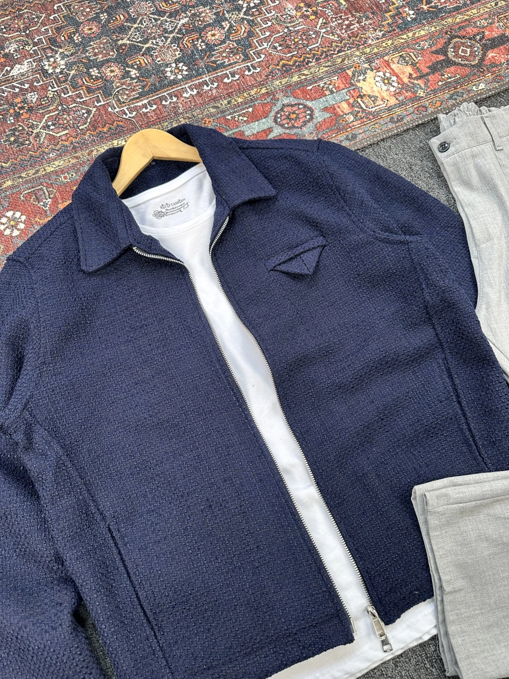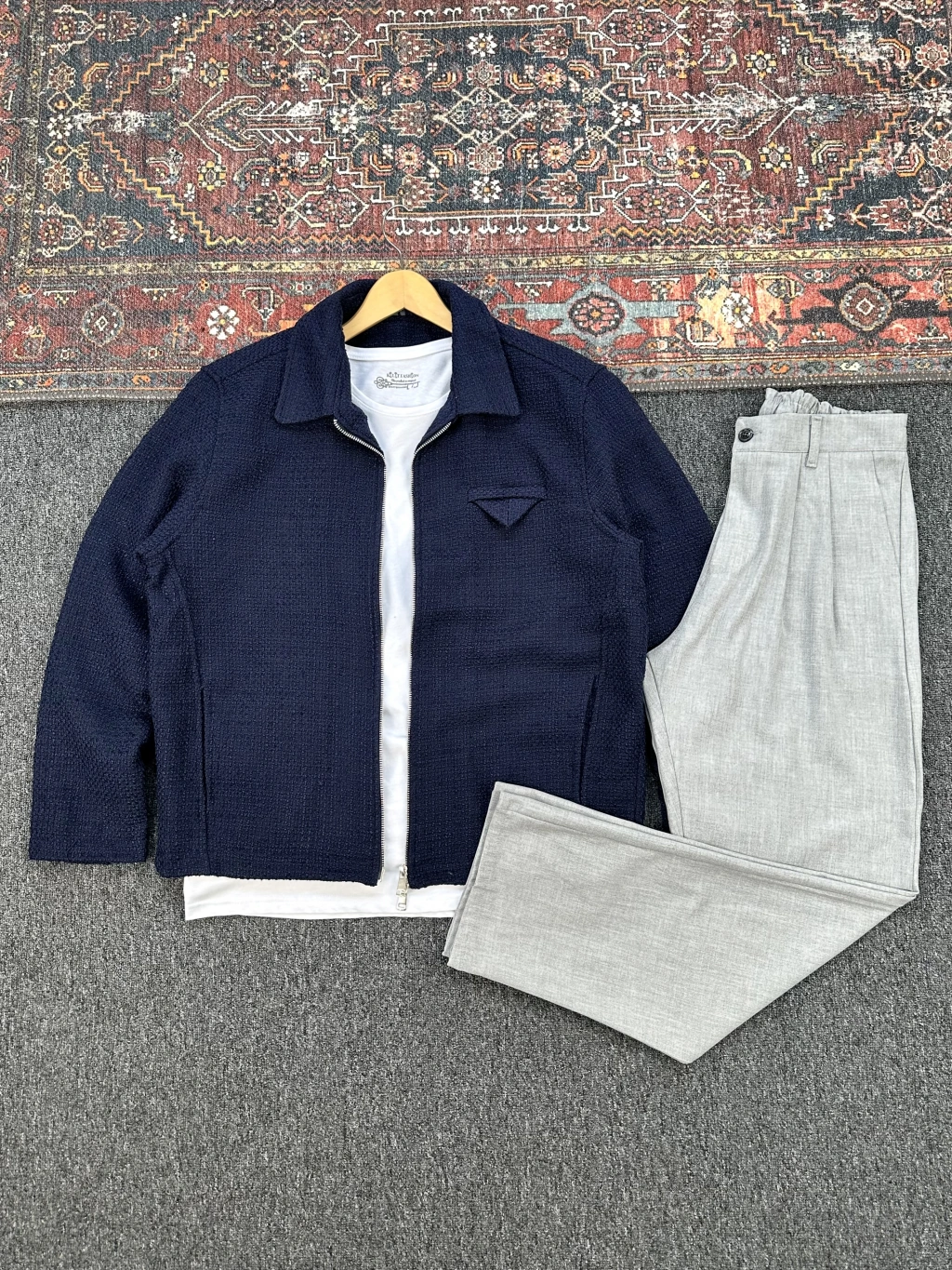Lacivert Örme Hasır Kumaş Ceket & Gri Pileli Kumaş Baggy Pantolon