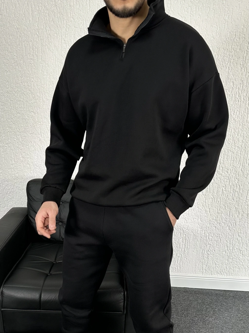 Siyah Üç İplik Yarım Fermuarlı Sweat